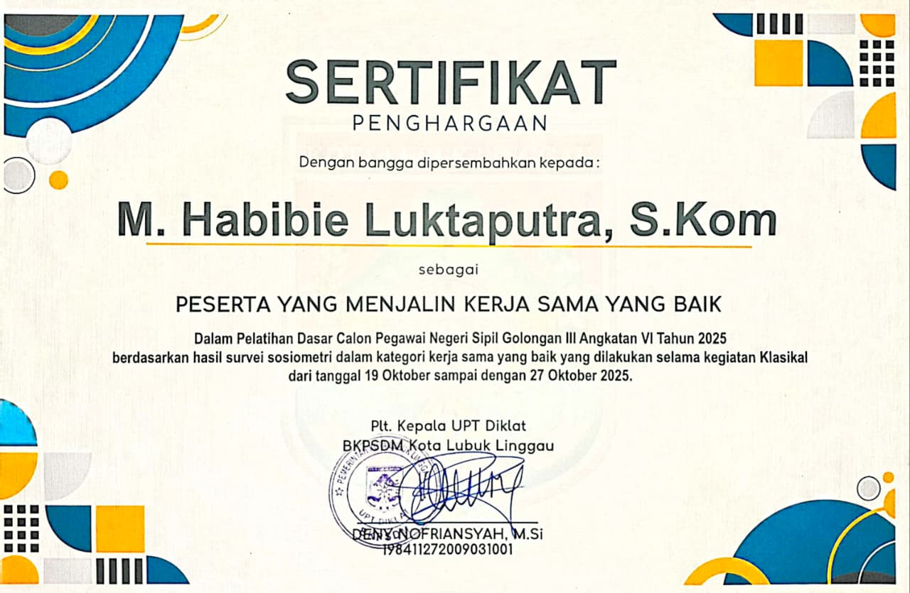 Magnet.news ,Lubuk Linggau, 28 Oktober 2025 — Prestasi membanggakan kembali ditorehkan oleh M. Habibie Luktaputra, ASN muda yang dikenal memiliki dedikasi tinggi dalam dunia birokrasi dan teknologi informasi. Dalam Pelatihan Dasar (Latsar) CPNS Tahun 2025 yang diselenggarakan oleh UPT Diklat BKPSDM Kota Lubuk Linggau, Habibie berhasil meraih Predikat “Sangat Memuaskan” dengan peringkat I pada Angkatan VI Gelombang IV.