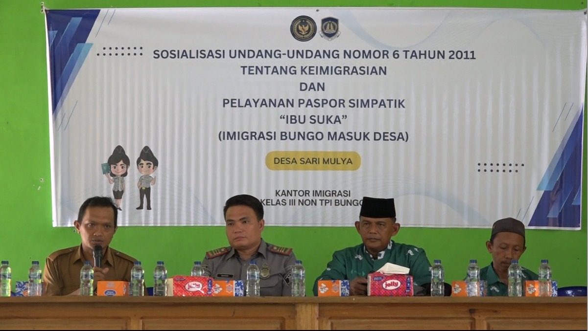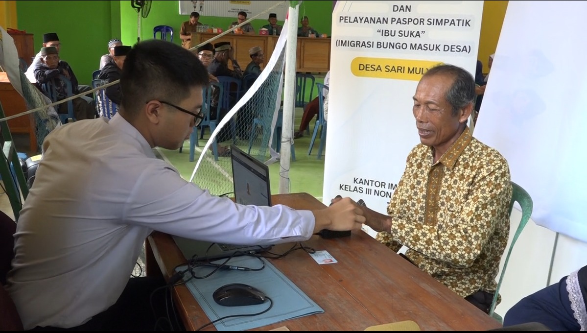Magnet news Tebo Kantor Imigrasi Kelas III Non TPI Bungo kembali menghadirkan inovasi pelayanan kepada masyarakat melalui program Paspor Simpatik “Ibu Suka” (Imigrasi Bungo Masuk Desa). Kali ini, layanan jemput bola tersebut dilaksanakan di Kantor Desa Sari Mulya, Kabupaten Tebo, sebagai bagian dari upaya mempermudah masyarakat dalam mengurus dokumen keimigrasian tanpa harus datang ke kantor imigrasi di Bungo.